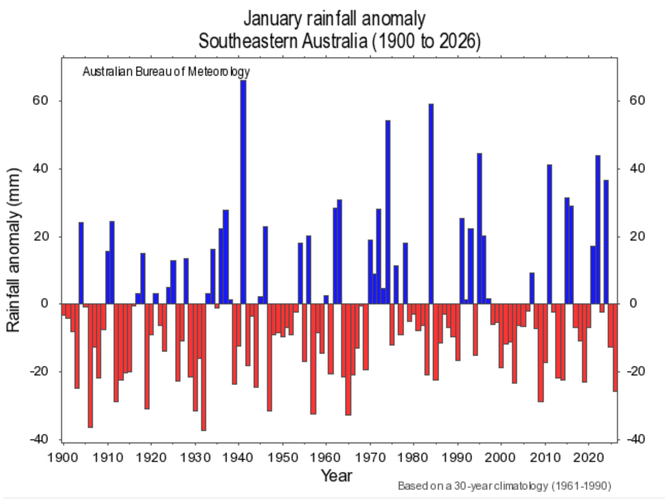 Image: January rainfall anomalies across southeastern Australia dating back to 1900. Source: BoM.