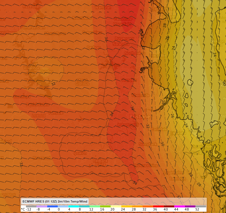 As many Brisbanites know, how hot the city gets depends on the development of the seabreeze; a well-developed seabreeze often moderates daytime temperatures in Brisbane city, whilst western suburbs and beyond bake.