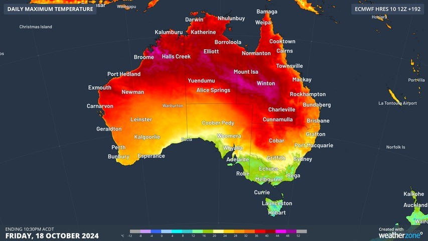 The map below shows the maximum temperature forecast for Tuesday, October 15 with temperatures reaching the 40s through the interior of Australia.