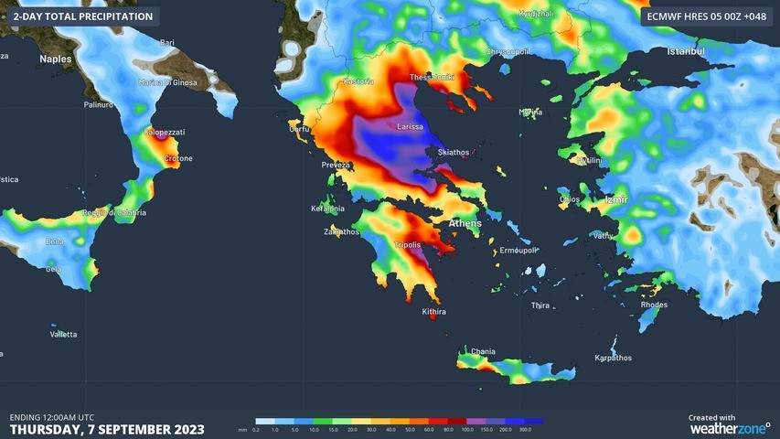 According to Meteo.gr, the heaviest daily total in the country as of 8:45pm local time on Tuesday was 754 mm. This was the heaviest daily rainfall on record in Greece, beating the previous record of 644.7 mm from September 2020.