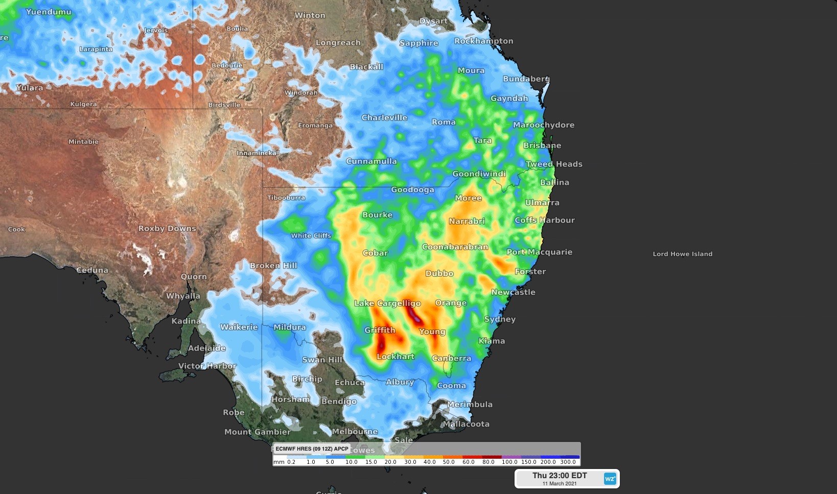Image: Forecast accumulated rain on Thursday, March 11, according to the ECMWF model. This shows the general area that could see rain on Thursday, some of which will come from thunderstorms.