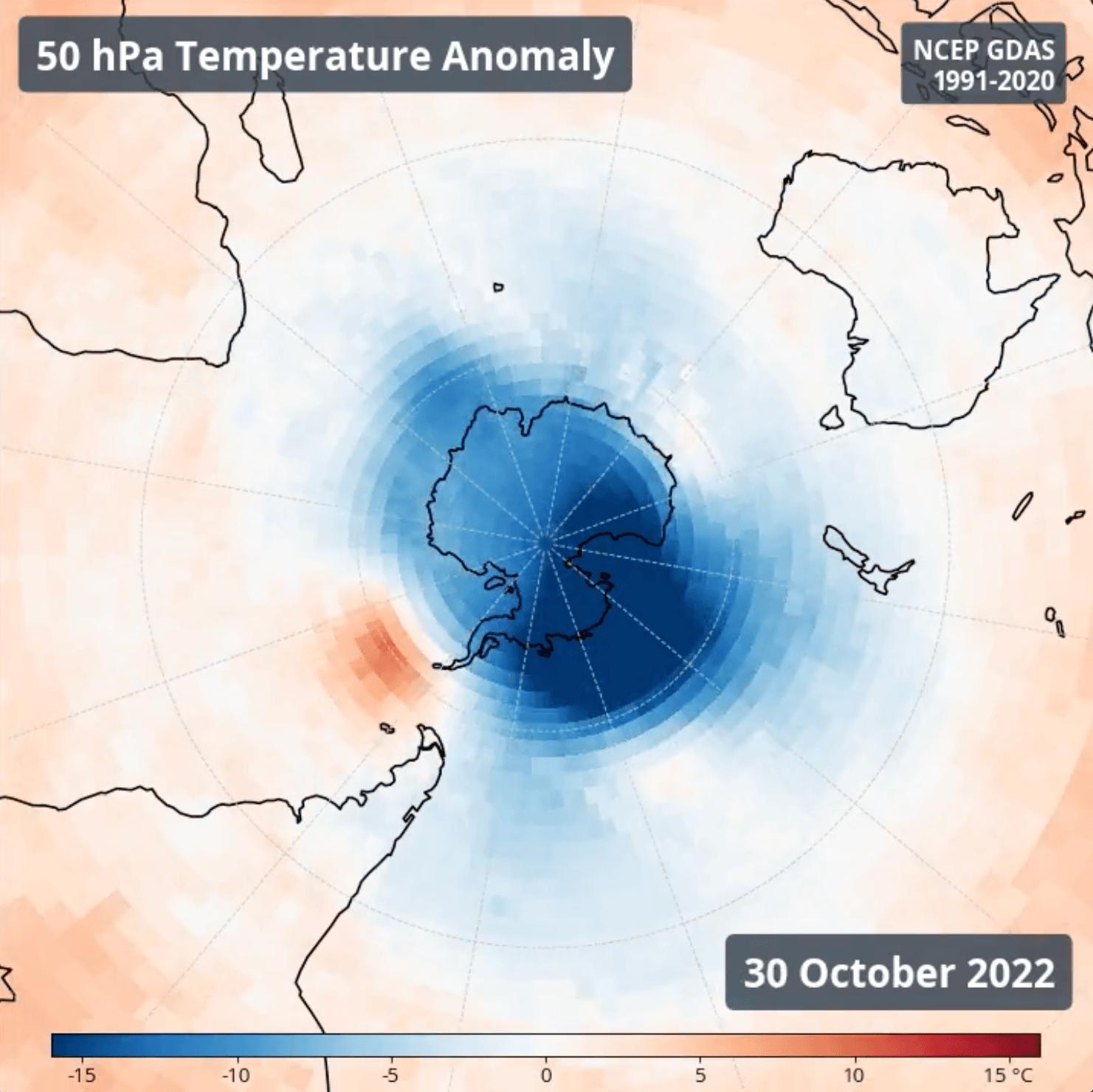 The southern stratospheric cold anomalies (shown here at 50 hPa, or about 20 km) are gradually converging on the pole. pic.twitter.com/9C3GYAF1HW