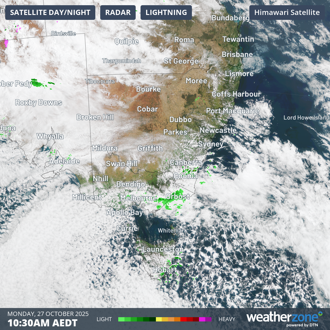 Image: A speckled cloud field (typically associated with a cold airmass with polar origins) can be seen off the SE corner of Australia on Monday, October 27, 2025, and is pushing north along the coast.