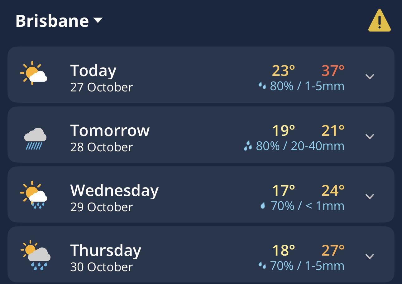 Image: Hot, cold, then close to average for Brisbane over the next four days, as seen in the Daily Forecast on the Weatherzone app.
