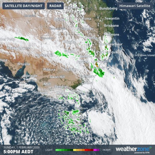 Image: 12 hour combined radar and satellite loop over SE Australia from the evening of Sunday, January 31, 2026 into the morning of Monday, February 1.