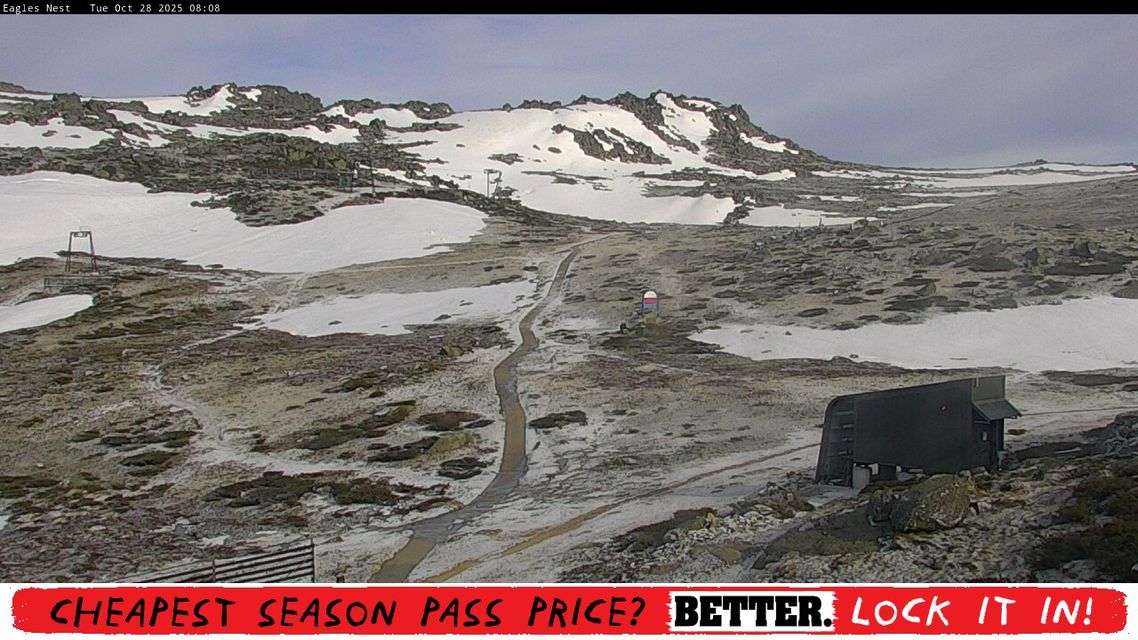 Image: The top of Thredbo (NSW) early on Tuesday morning, with a mixture of light fresh snow and remnant snow patches from winter after a minimum of -7.9°C which wasn't quite as cold as nearby Perisher Valley's -8.8°C. Source: Thredbo.com.au.