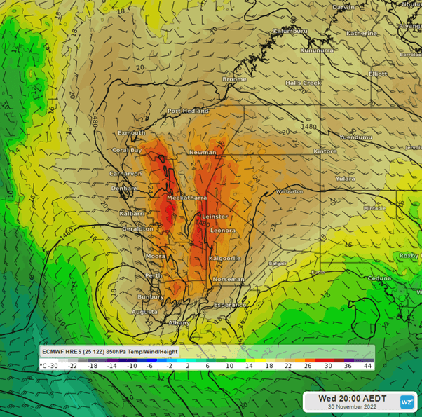 Image: 850 hPa temperatures on Wed 30th 5pm WST using ECMWF