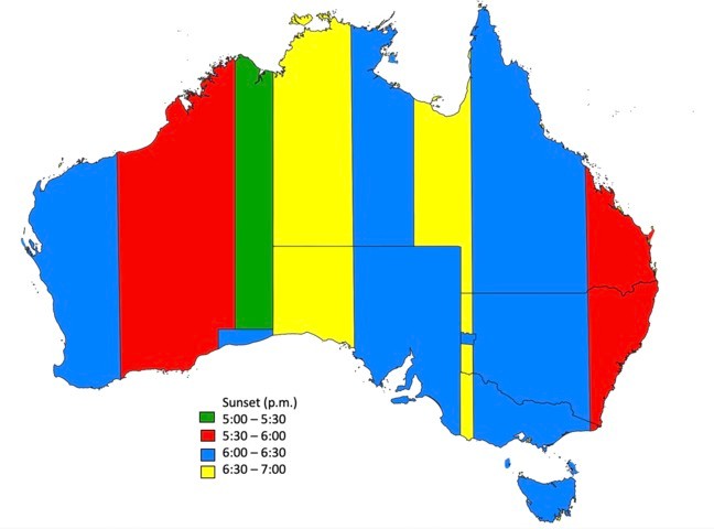 Towards the eastern side of local time zones, the sun logically tends to set earlier, as seen in the far eastern part of Western Australia, excluding the Australian Central Western Standard Time (ACWST), detailed here. Conversely, on the western side of time zones, the sun tends to set later. With parts of western Queensland, New South Wales, Victoria, South Australia and the Northern Territory having the sun set as late as 7:00pm.