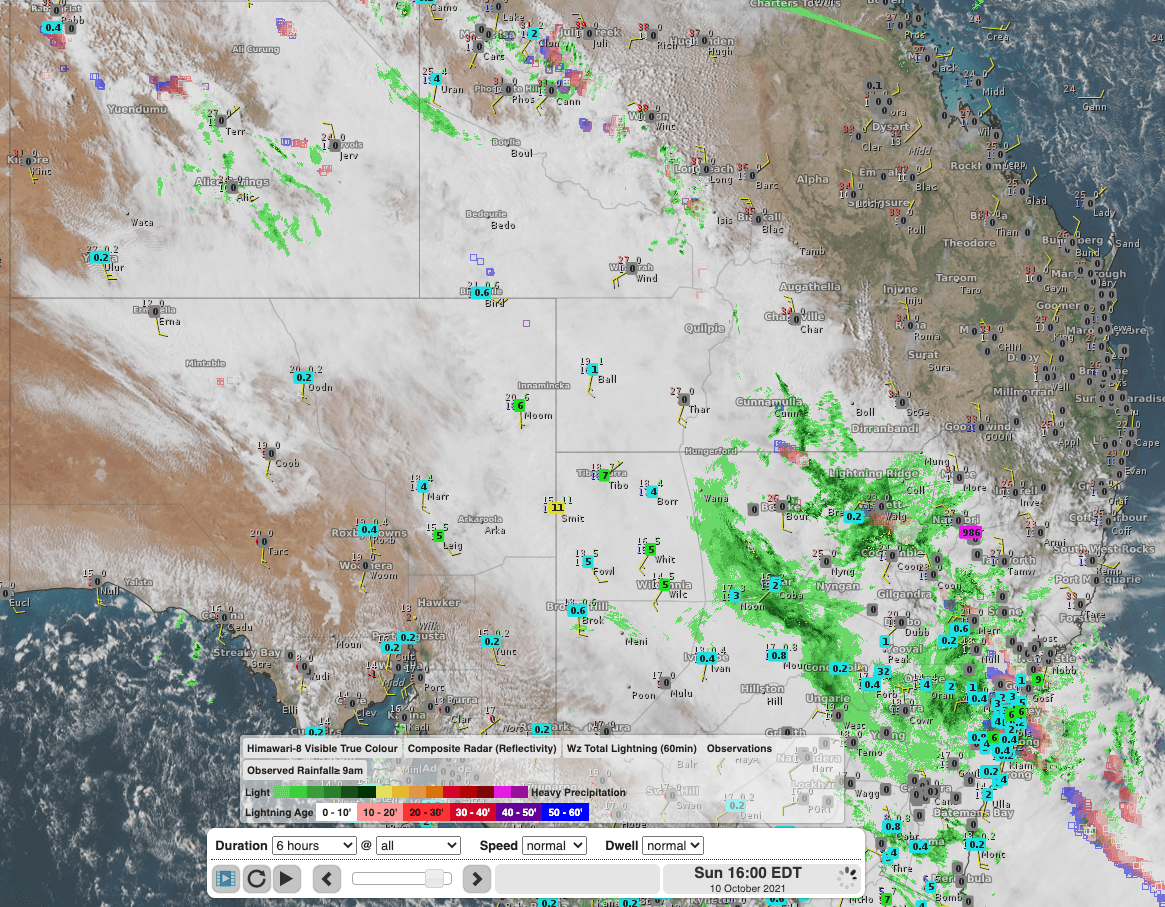 Satellite imagery (Himawari-8 Visible True Colour) showing an expansive area of thick cloud with this trough stretching from the Northern Territory into NSW. Radar and Observation (rainfall from 9am to 4pm) overlay show widespread rainfall over much of the state.
