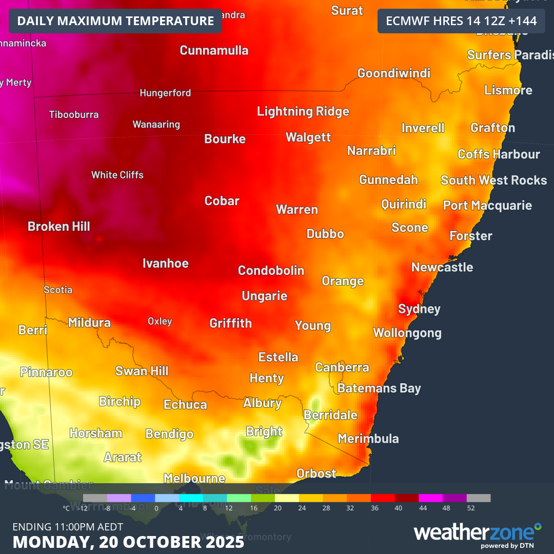 Image: Forecast maximum temperatures on Monday, October 20, 2025.