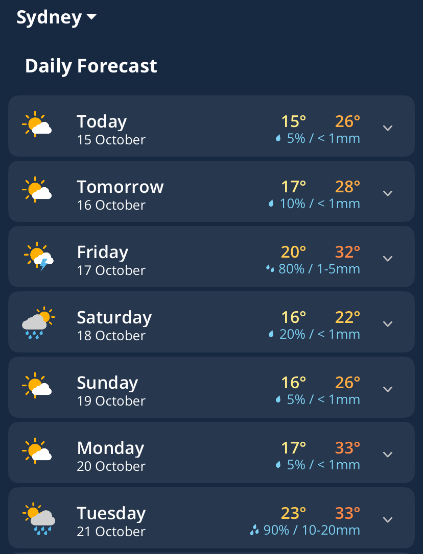Image: Sydney’s daily forecasts in the Weatherzone app showing more warm days ahead.
