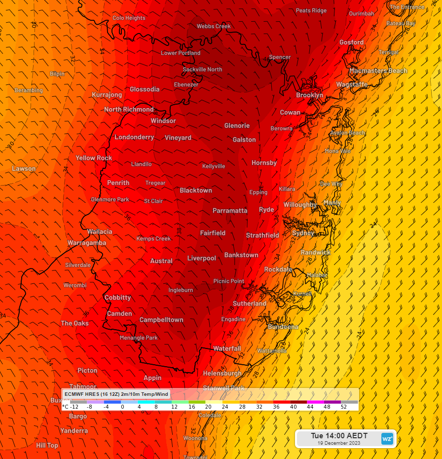 Image: 2m temperature and 10m wind barbs at 2pm AEDT on Tuesday 19th December according to the ECMWF model