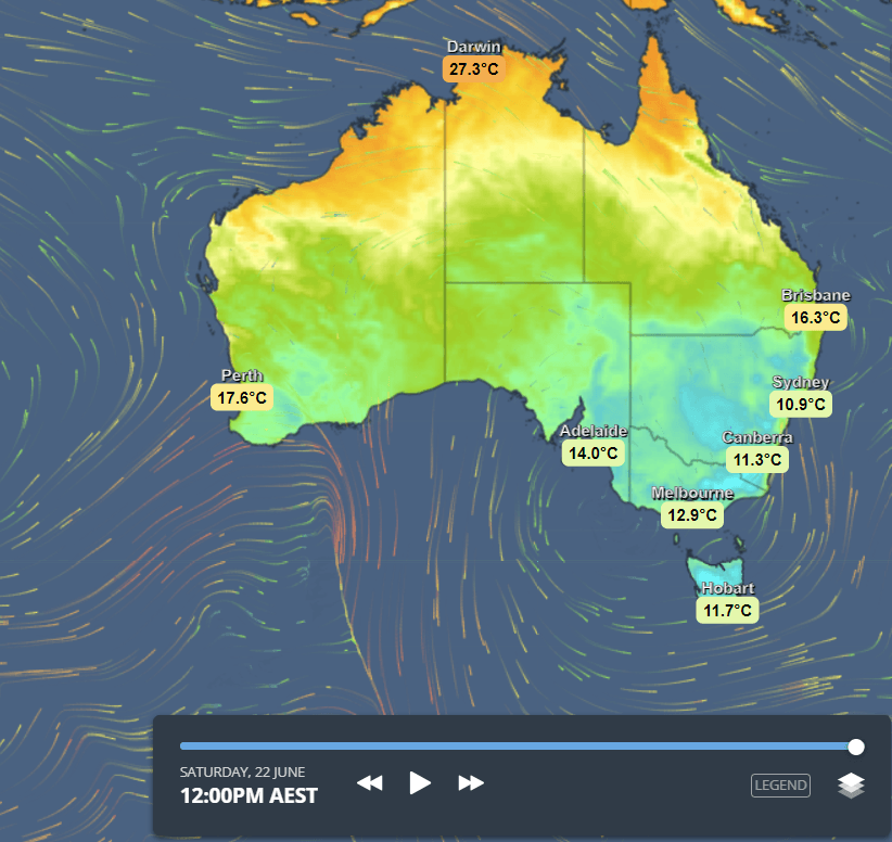 On top of being the coldest capital, Sydney was feeling like just 7.2 degrees at noon! Looking around Australia, temperatures (and feels like temperatures) at 12pm (AEST) for the other capitals were