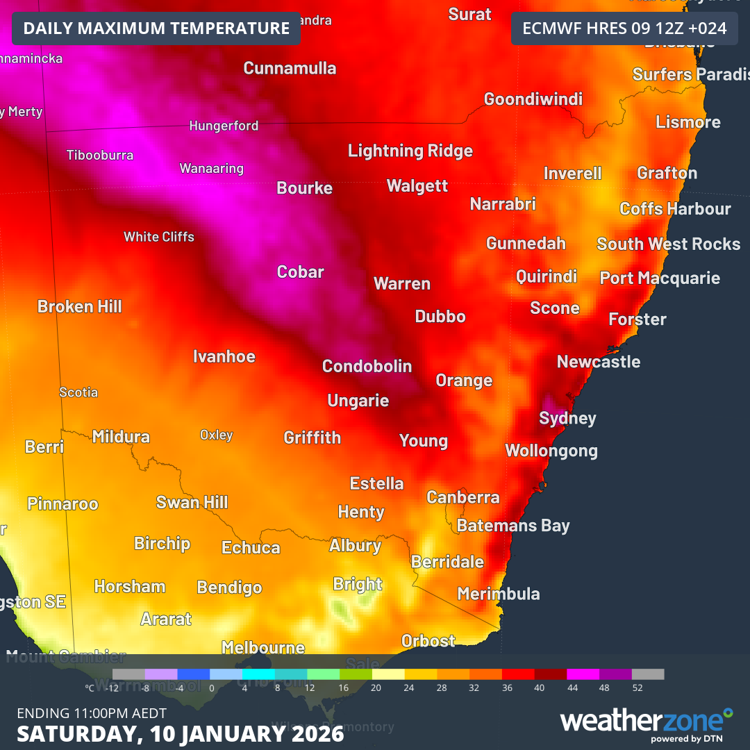 Sydney’s maximum temperature peaked at 42.2°C this Saturday, January 10, making it the second time in the summer of 2025/26 that the harbour city has reached exactly that mark (the other day was December 19).