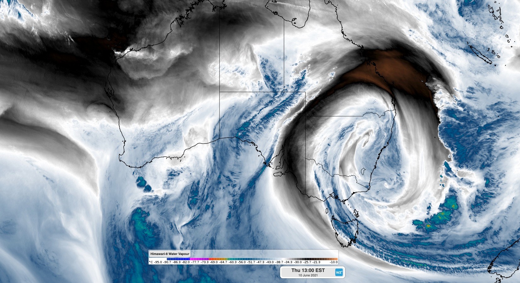 Image: Enhanced water vapour satellite image showing the upper-level cut-off low over NSW on Thursday.