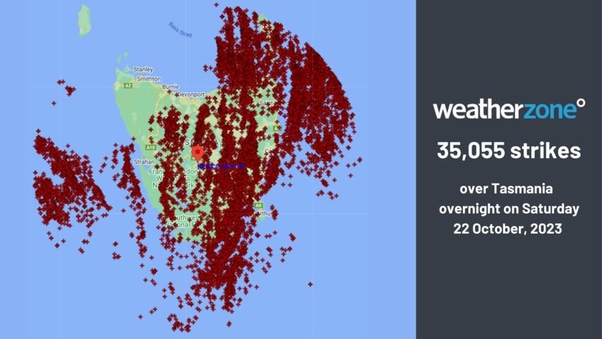 Over 35,000 lightning strikes have been recorded over Tasmania on Saturday night as a line of thunderstorms marched across the state.