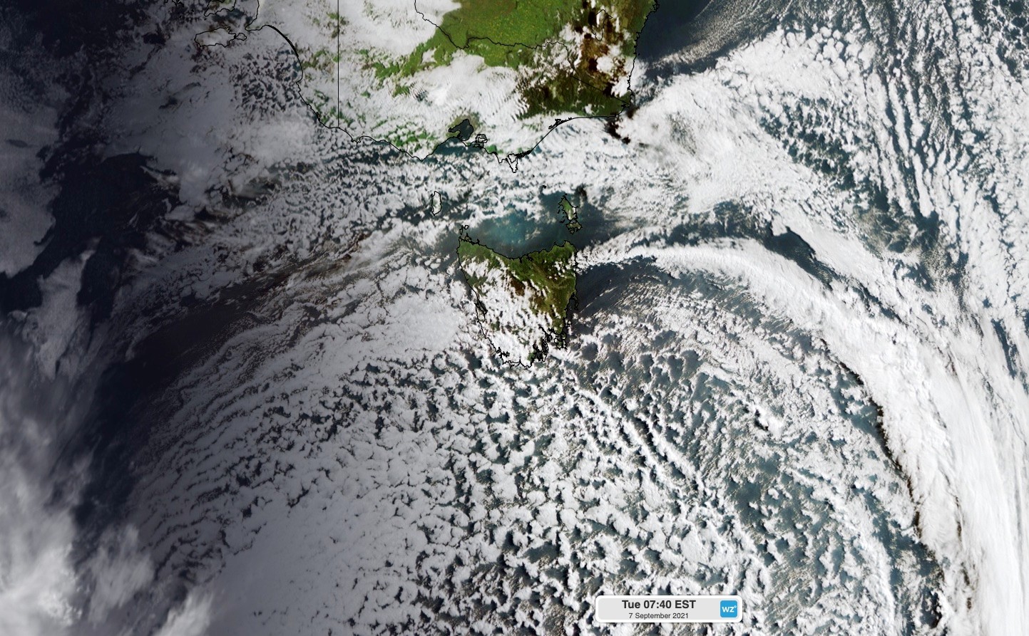 Video: Satellite images showing the cold front crossing Tasmania during Monday night, before moving out into the Tasman Sea on Tuesday morning.