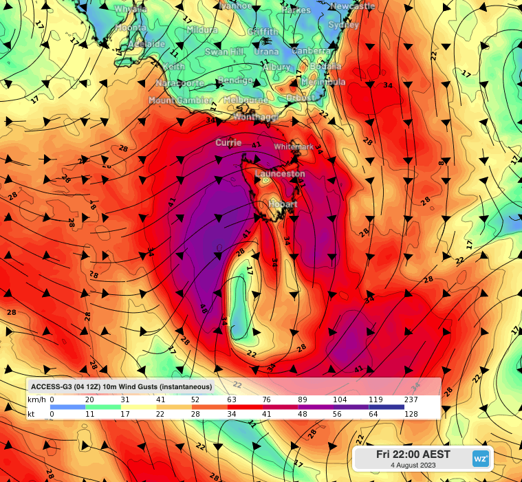 Access-G 10m wind gusts over Tasmania leading into the early hours of the morning on Saturday 5th