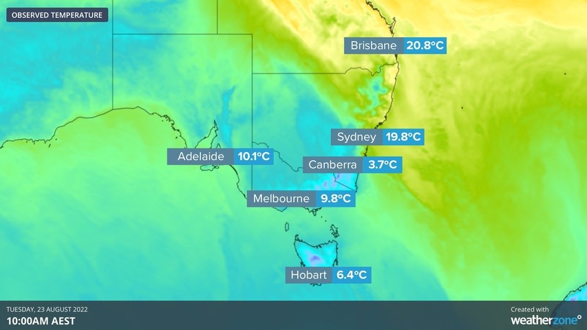 By 10am AEST on Tuesday, there was a large temperature contrast across southeastern Australia. Much of NSW and QLD were still enjoying warmer air ahead of the front, while southern NSW, the ACT, VIC, TAS and most of SA were enduring much colder air in its wake.