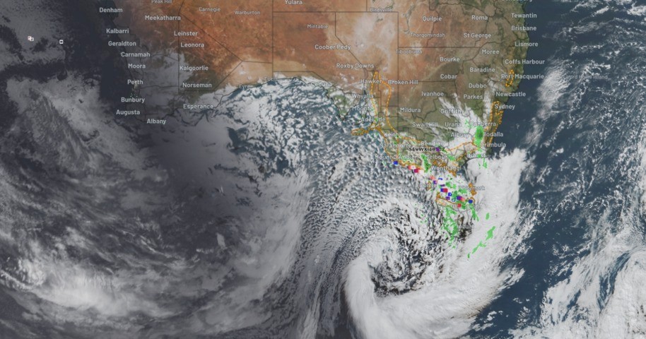 The strongest winds so far have been measured closest to the front over South Australia and western alpine Victoria, with Neptune Island recording a 135 km/h westerly gust this morning–its strongest wind gust since July 2016. Mt Buller clocked a 109km/h north-northwesterly gust before dawn and winds there and over the larger alpine area are going to increase during the afternoon as snow also increases.