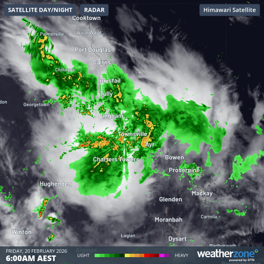 Image: Four-hour radar loop showing relatively slow-moving storms within a 1000km radius of Townsville, Qld, on the morning of February 20, 2026.