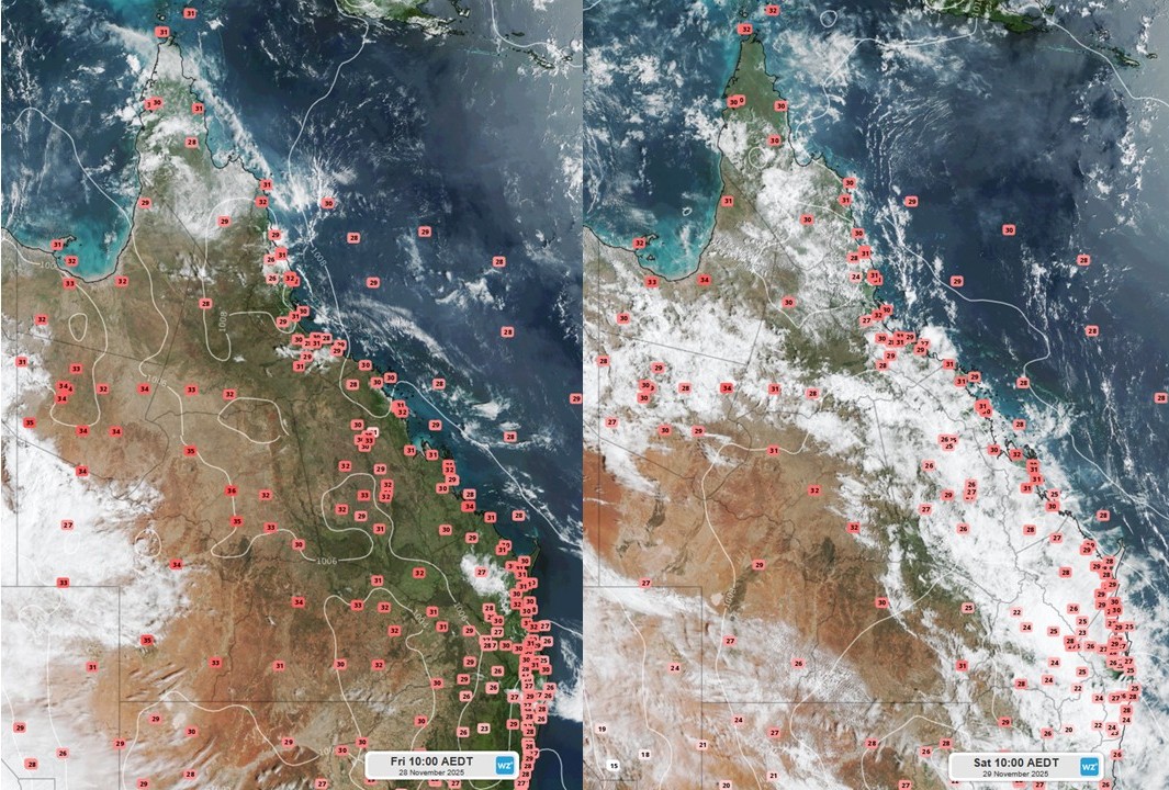 Image: (Left) Temperatures across Queensland at 3pm local time on November 28th with the heat trough. (Right) Temperatures across Queensland at 4am local time on November 29th