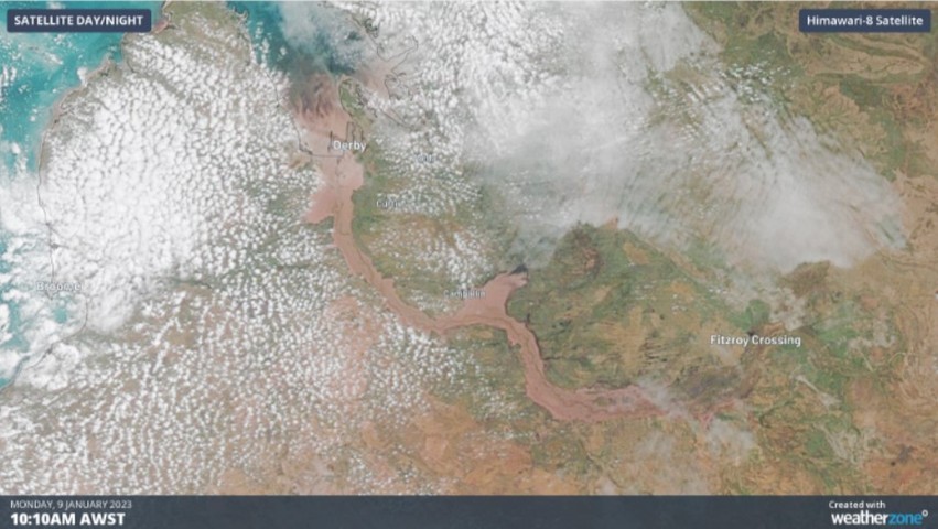 The satellite image above (taken Monday) shows the dramatic sight of the Fitzroy River in full flood.