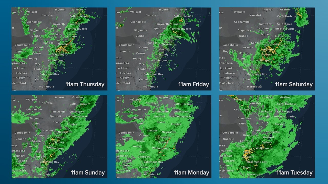 They're a snapshot of the radar over the Sydney region at 11 am on each of the six days of heavy rain from Thursday last week to Tuesday this week.