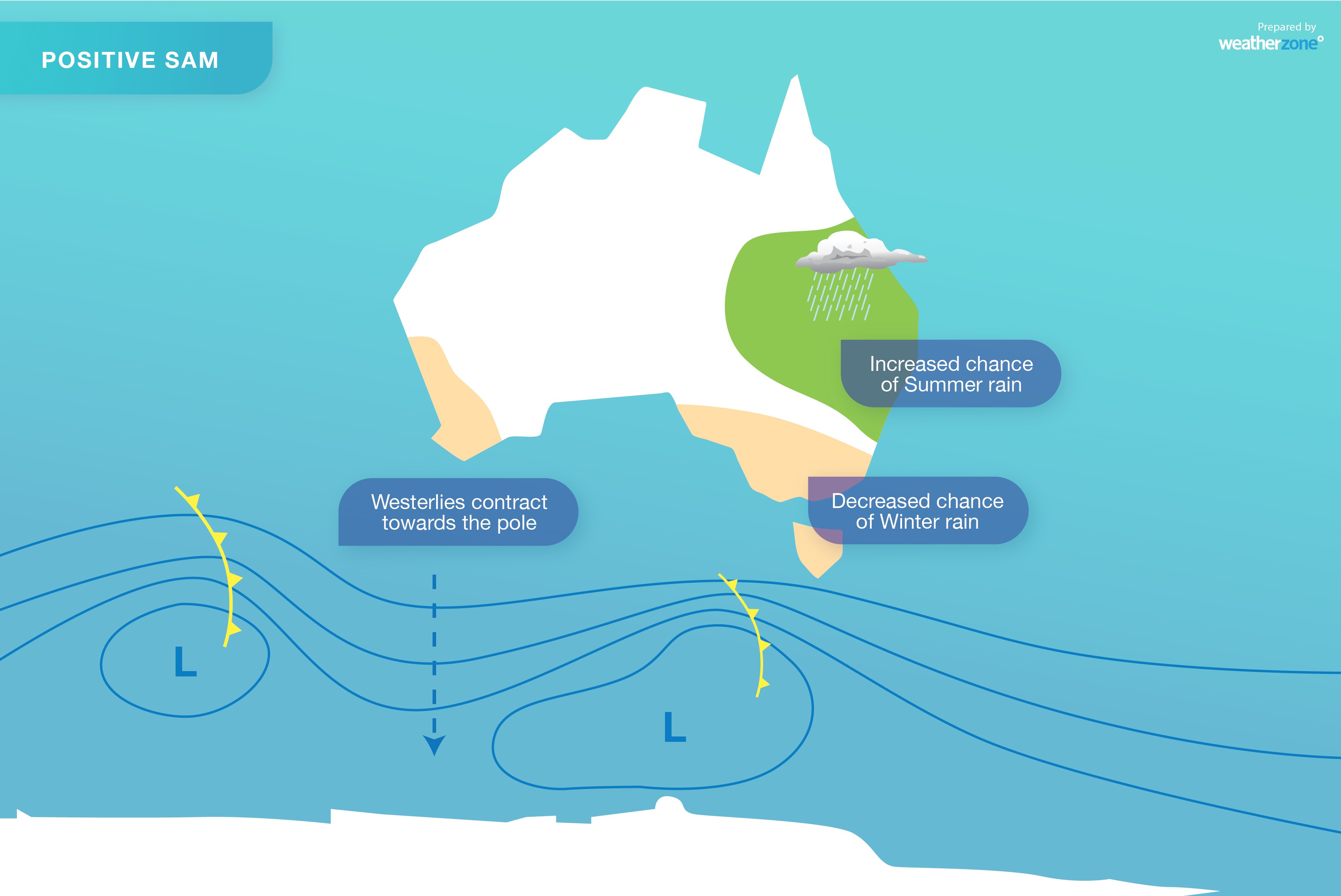 In winter, this southward displacement causes abnormally high pressure over southern Australia, which can reduce winter-time rainfall over some of our southern states. But if a positive SAM happens in late spring or summer, we can see an increase in onshore winds along the east coast, leading to more rainfall and less extreme heat over large areas of eastern and southeastern Australia.