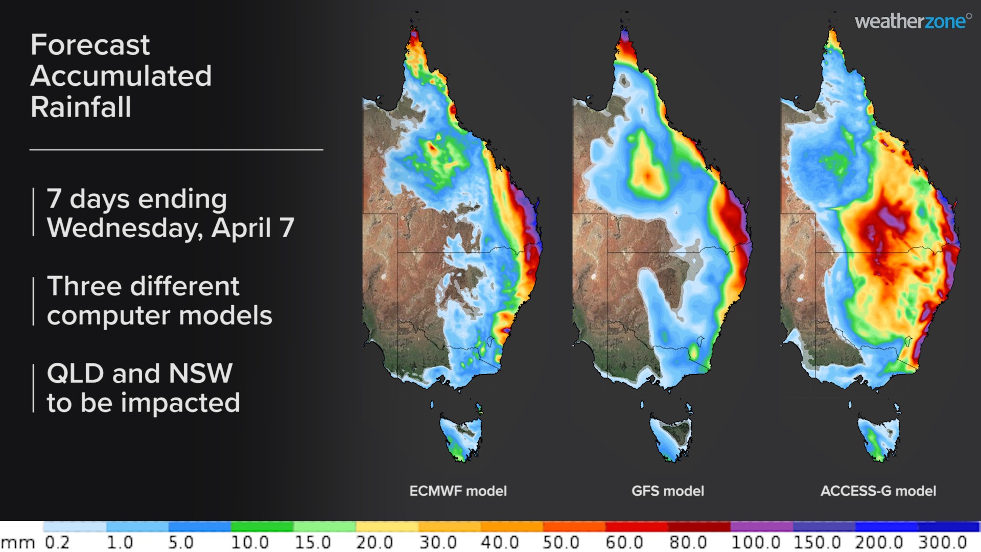 Image: Forecast accumulated rainfall during the first 7 days of April according to three different computer models.