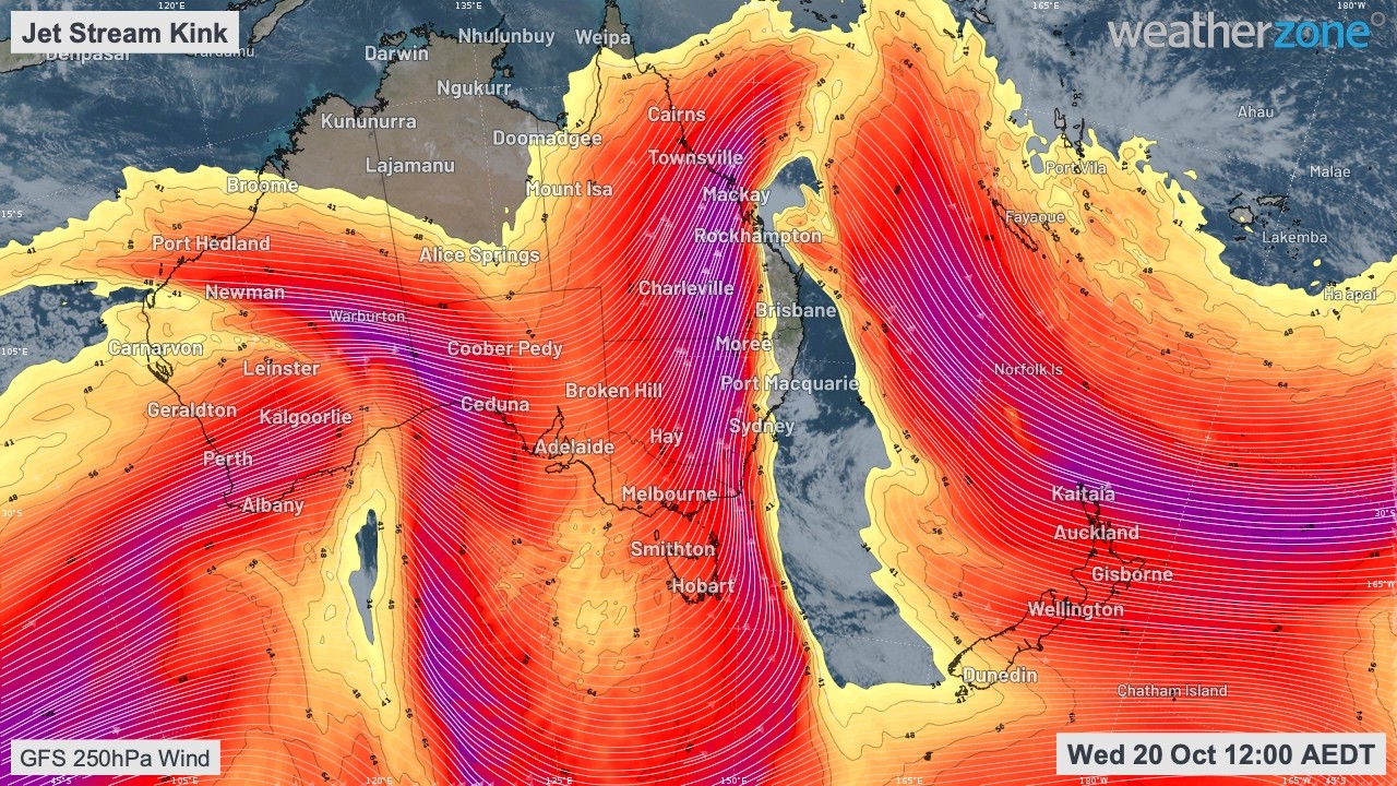 Image: Upper-level winds developed a strong southerly component over eastern Australia, thanks to a kink in the jet stream. This is called meridional flow, meaning the air flows in a north-south orientation.