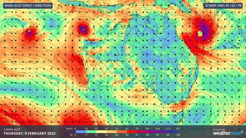 Image: Forecast wind gusts speed and direction on Thursday morning this week, according to the ECMWF-HRES model, showing three tropical lows or tropical cyclones spinning over the Australian region.