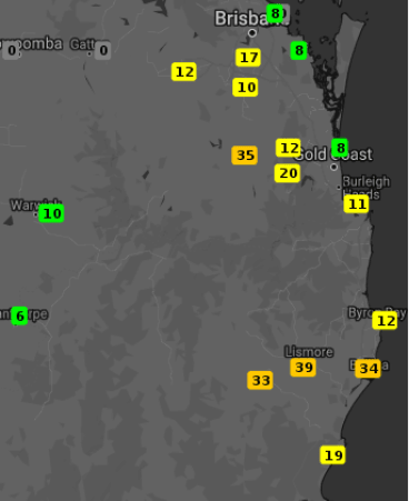 Some rainfall totals include: Beaudesert with 35mm and Yeppoon with 48mm (not on the map), in NSW Lismore reported 39mm.