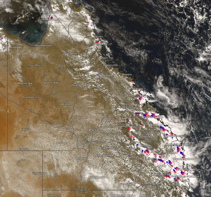 Image: Satellite imagery (Himawari-8) with lightning overlay at 3pm EDT Sunday