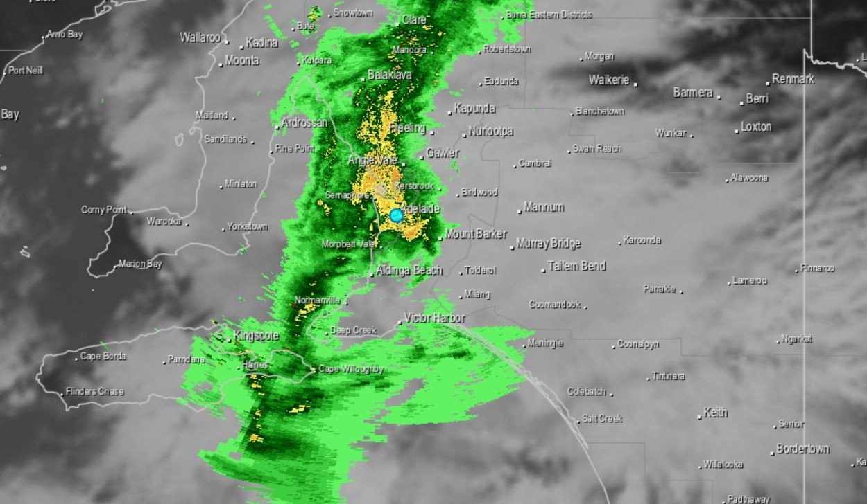Image: The scene in the Adelaide area around midday Wednesday as fast-moving storms raced through.