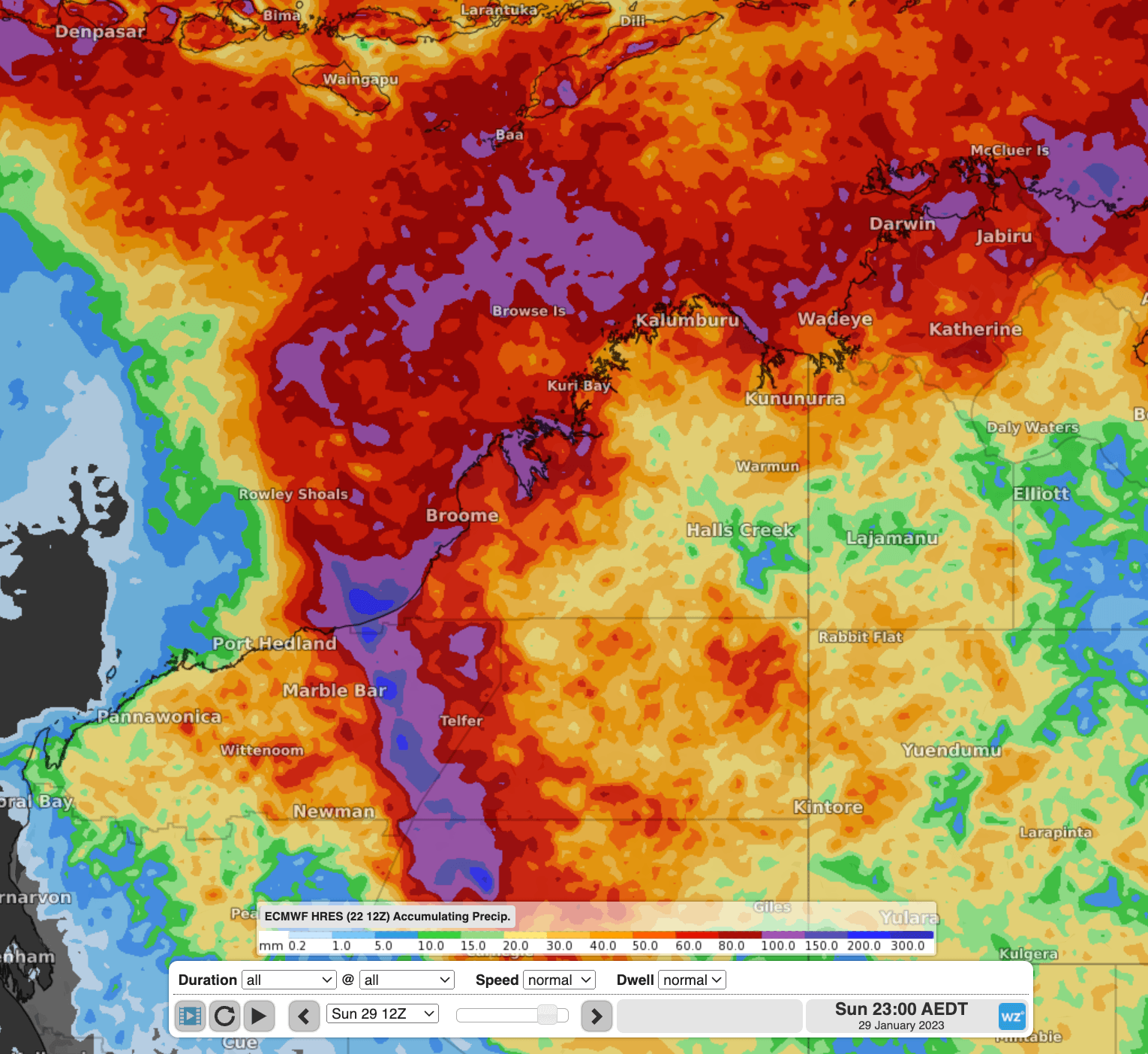 Intense rainfall is also likely to occur as this system crosses the coast and is still expected even if the system doesn’t fully intensify into a tropical cyclone. Models are predicting areas near the low and on its eastern flank to receive 150-300mm of rainfall in 12-36 hours, but landfall will be short and sharp due to its fast-moving speed. Furthermore, its fast movement could push heavy rainfall well into the interior of WA.