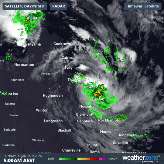 At 4am (AEST) on Sunday, January 11, Koji was a category 1 tropical cyclone, with sustained winds near the centre around 85km/h and peak gusts around 120km/h. The system was located approximately 120km east-northeast of Townsville and 120km north-northwest of Bowen, tracking south at around 18km/h.