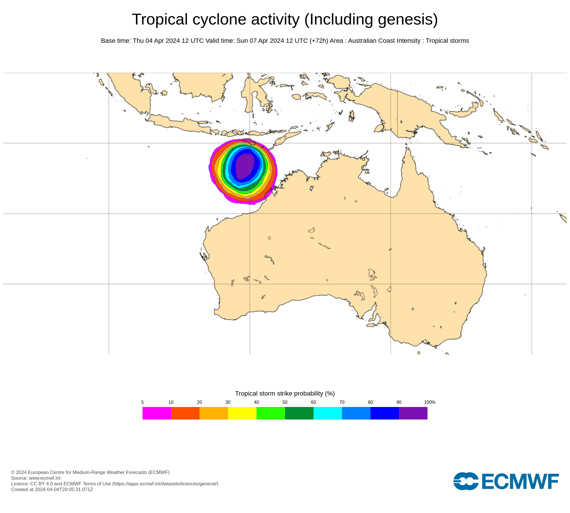 Other international forecast organisations also show a strong possibility of tropical cyclone development near WA on the weekend. The image below shows the likelihood of tropical cyclone activity within a 48-hour window of Sunday night, according to the European Centre for Medium-Range Weather Forecasts (ECMWF),