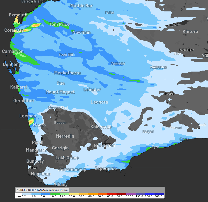 Unfortunately, both models agree that the southwest corner of WA, including Perth, will miss this week's rain. This region is desperately dry, with some areas recording the lowest rainfall on record during the first three months of this year.