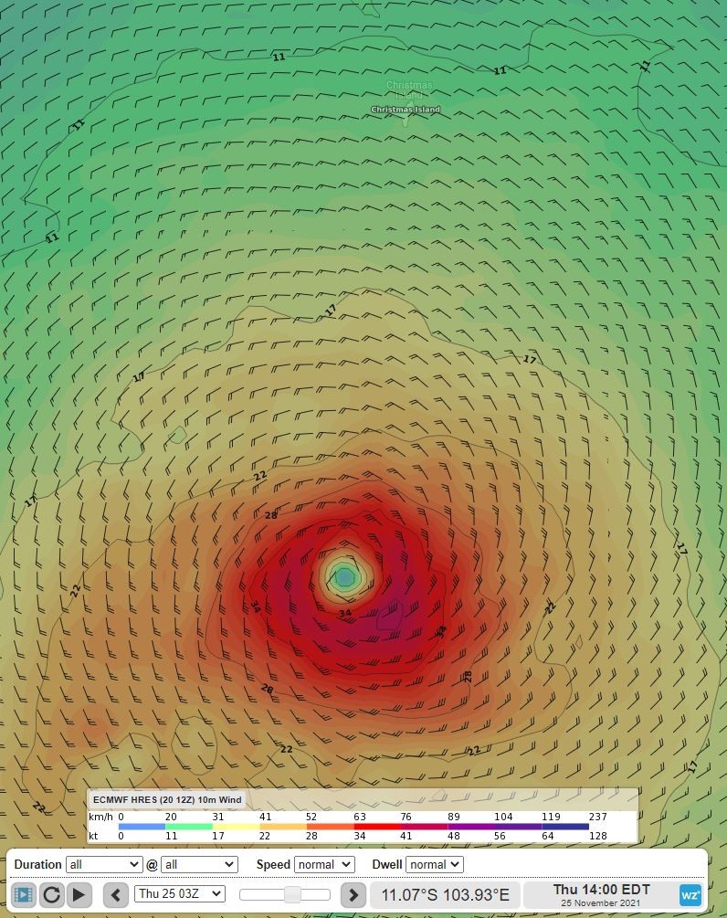 Image: Location of a tropical low (south of Christmas Island) on Thursday November 25th afternoon according to the ECMWF model