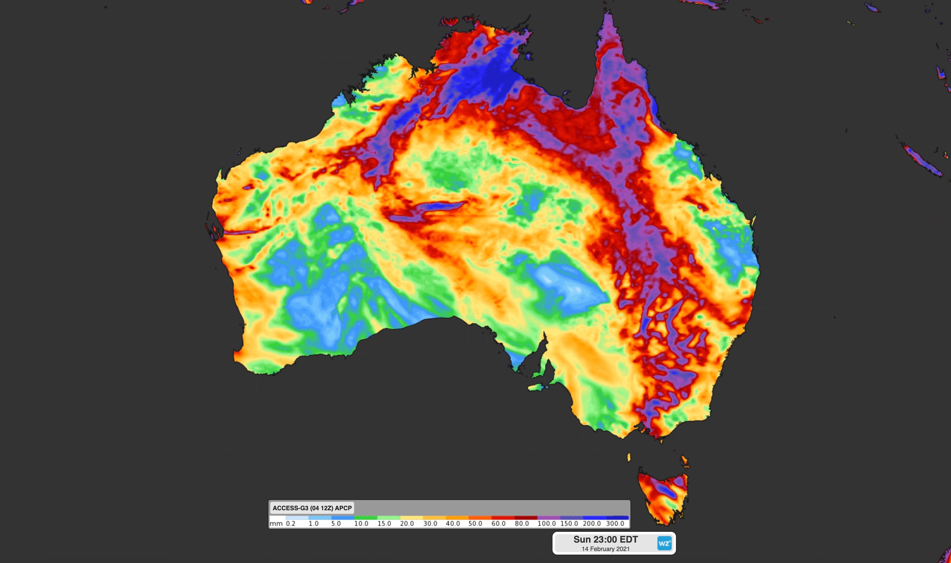 Images: Forecast accumulated rain during the 10 days ending on Sunday, February 14, according to the ACCESS-G (top), ECMWF (middle) and GFS (bottom) models.