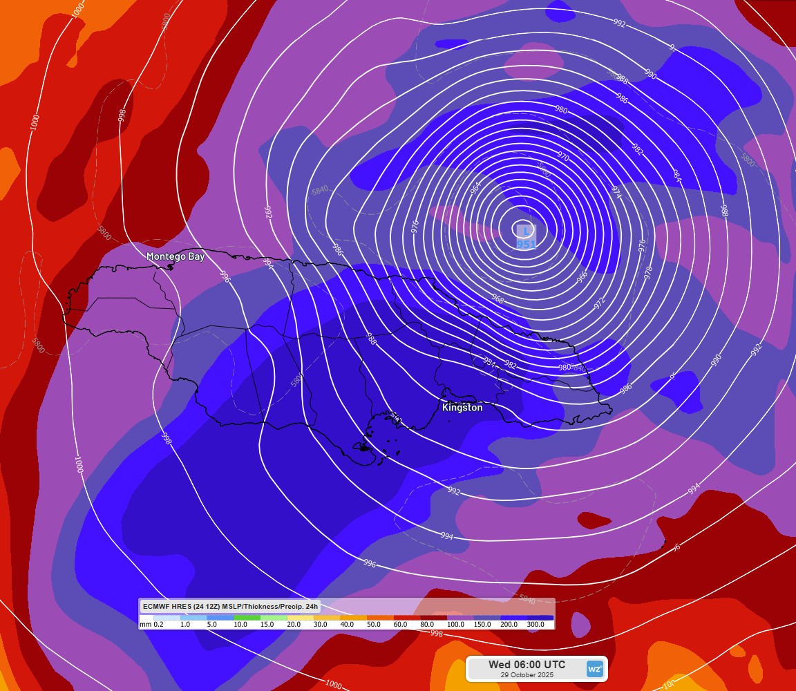 Image: 24-hour rain accumulations to 06:00 UTC (1am Jamaica time), Wednesday, October 29.
