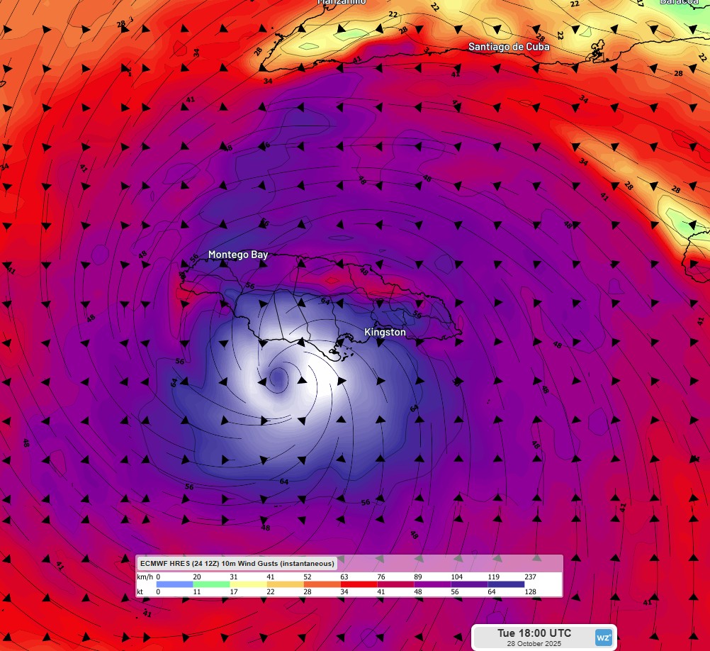 Image: ECMWF wind gust forecasts at 18:00 UTC (about midday Jamaica time) on Tuesday, 28 October. The white blob near Jamaica's southernmost tip indicates wind gusts exceeding 250 km/h.