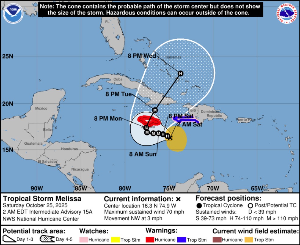Image: Forecast track and cone of uncertainty for Tropical Storm/Hurricane Melissa over the next few days. Source: NOAA