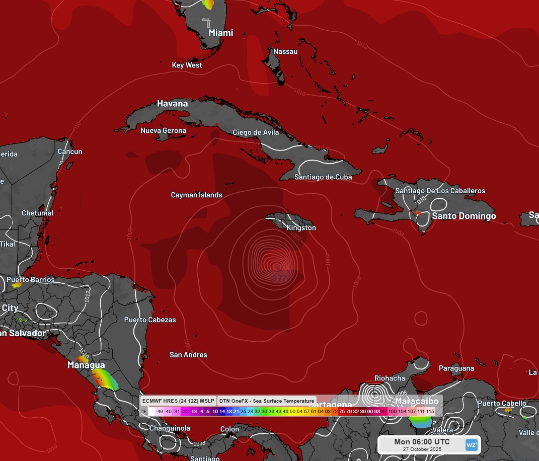 Image: Sea surface temperature in the Caribbean Sea. Here, the ECMWF model is projecting that TS Melissa will move into the warmer waters shown in dark red by early morning on Monday, October 27.