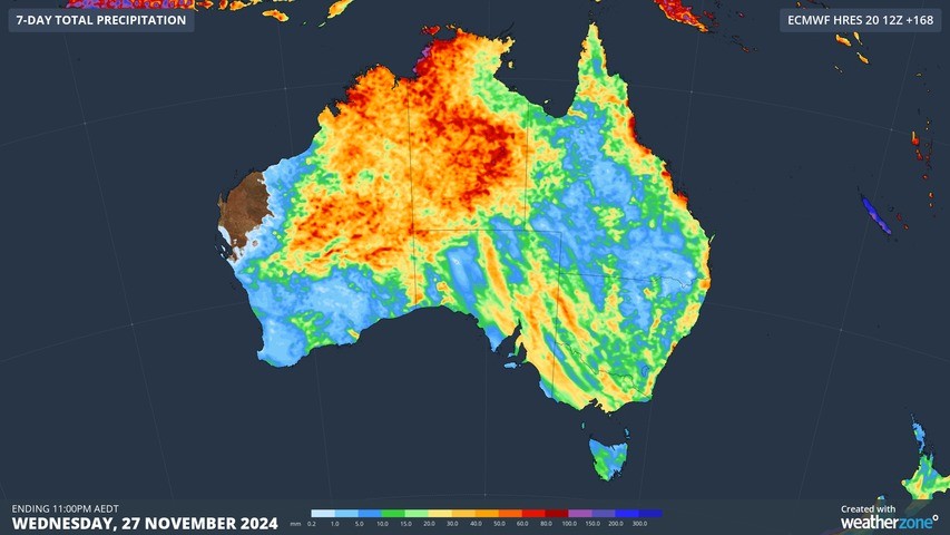 There are also signs that the monsoon could also arrive across northern Australia during the middle of next week increasing the risk of unsettled weather further. The map below shows decent rainfall totals across northern Australia in the coming week.