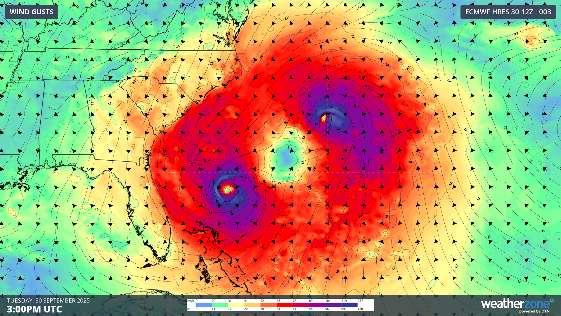 Image: Modelled wind gusts around Hurricanes Humberto and Imelda.