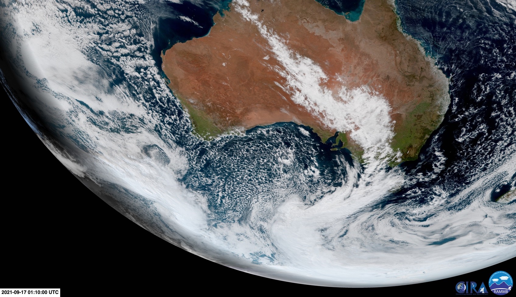 Image: Satellite image captured by the Himawari-8 satellite at 11:10am AEST on Friday, September 17. The image has been annotated with green circles to highlight two cold fronts and a north west cloud band. Source: RAMMB/CIRA
