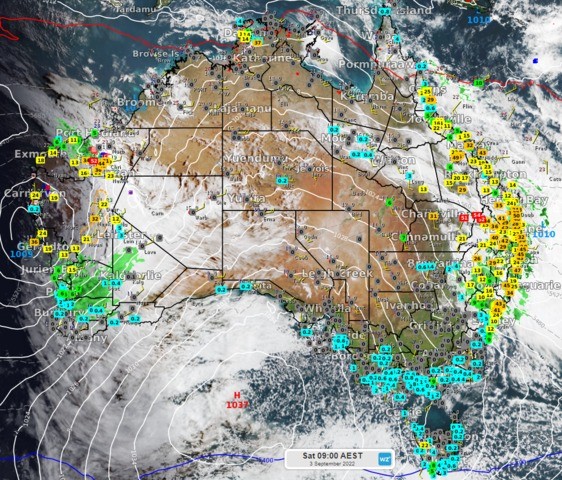 It’s unusually wet for this time of year, the heaviest September rain in 56 years at Injune (45mm in 24 hours), 25 years at Warwick (42mm in 48 hours), 24 years at Dalby (37mm in 24 hours) and Toowoomba (23mm in 24 hours), 16 years at Lismore (45mm in 48 hours), 14 years at Surat (34mm in 24 hours) and Nambour (40mm in 24 hours) and 12 years at Tewantin (50mm in 48 hours), Logan (22mm in 48 hours) and Gympie (37mm) and 11 years at Taree (35mm).