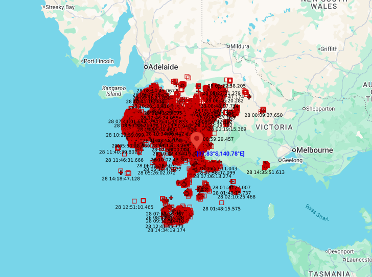 Rainfall is expected to persist over South Australia this weekend, slowly moving into Victoria and western NSW on Monday as a front pushes the weakening low eastward. The heaviest rainfall is expected with thunderstorms, as southeast South Australia experienced this morning; more than 110,000 lightning strikes in the 300km around Mount Gambier Saturday 28th morning and 10 to 30mm of rainfall per location in the vicinity. A severe weather warning was issued for these thunderstorms by the Bureau of Meteorology for this morning.